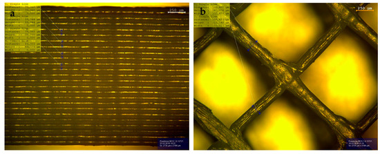 After printing, all samples were debinded and sintered as described above. In Figure 8, light microscopic pictures of a sintered open structure of 50 vol % alumina are shown. The sample was printed with a nozzle size of 150 µm and a layer thickness of 100 µm. After sintering, the layer thicknesses achieve 80 to 90 µm, and the bar reaches a width of 160 µm. In Figure 9b, the densities of all sintered samples are shown. The density of the sintered open-structured samples reaches up to 98.4% of the theoretical density.