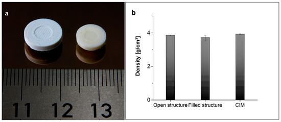 Test discs with 100% infill were debinded and sintered together with disks prepared by ceramic injection molding (CIM), applying the same highly-filled composite (denominated “feedstock” in CIM) to compare the resulting sinter densities. A green and a sintered printed test disc are shown in Figure 9a. While the CIM samples reach densities up to 99.7% of the theoretical density, the printed sample has values up to 97.3% of the theoretical density.