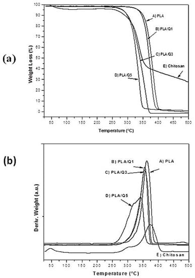 The thermal behaviors of PLA, chitosan, and composites were evaluated by thermogravimetric (TG) analysis, and the weight losses during heating and their derivatives are shown in Figure 2a,b, respectively. The TG curve of chitosan exhibits three decomposition stages. The first occurs from room temperature to ~87 °C with ~5 wt % loss; it can be attributed to the evaporation of adsorbed water. The second stage starts at 250 °C, with a maximum weight loss rate at ~300 °C, but it is overlapped with the beginning of the third stage, that presents a maximum weight loss rate at 390 °C that continues above 500 °C. The total weight loss of both stages is ~75%; this is due to the degradation process which includes the dehydration of saccharide rings and the polymerization and decomposition of acetylated and deacetylated units of chitin. For PLA, there is one weight loss stage between 300 and 390 °C, with a maximum rate at 357 °C, and a total weight loss of ~95%, that is related to the breaking of ester bonds and the release of gaseous products such as cyclic oligomers, lactide molecules, acetaldehyde, and carbon monoxide [31]. The PLA/chitosan composites present two stages of decomposition. In comparison with the PLA matrix thermal decomposition, the composite’s decomposition temperatures decrease with increasing the amount of chitosan particles. In the PLA/Q5 composite, the first decomposition step starts at ~230 °C, and has a maximum weight loss rate at ~320 °C. These two temperatures roughly correspond with chitosan’s first decomposition stage, so this is probably related to the decomposition of chitosan in the composite. The PLA/Q5 composite shows a second decomposition event that has a maximum rate at ~340 °C; this temperature is lower than the maximum decomposition rate temperature for PLA and chitosan alone; therefore, it is reasonable to assume that the decomposition of the PLA and chitosan composite components occurs simultaneously, and that the liberated decomposition products accelerate the decomposition reaction of both.