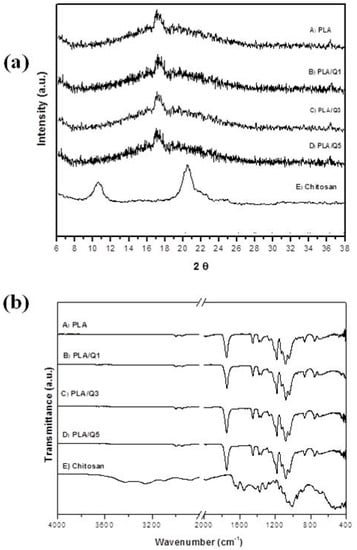 (a) X-ray diffraction patterns and (b) FT-IR spectra of A) PLA; PLA/chitosan composites with B) 1 wt % (PLA/Q1), C) 3 wt % (PLA/Q3), D) 5 wt % (PLA/Q5) chitosan, and E) chitosan.