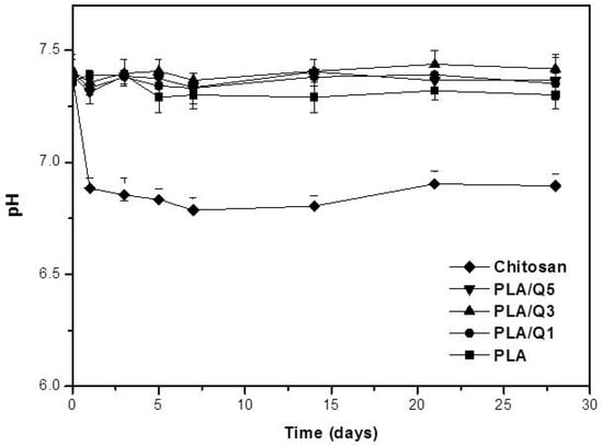 Changes in pH of PBS solution after different immersion times of PLA, chitosan, and PLA/chitosan composites with 1 wt % (PLA/Q1), 3 wt % (PLA/Q3), and 5 wt % (PLA/Q5) chitosan.