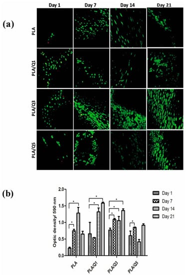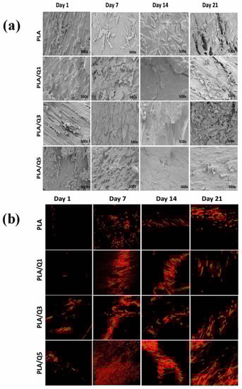 The adhesion and distribution of the MG-63 osteoblast cells on the PLA and the composites surface after different incubation times were studied by SEM and Confocal Microscopy; the images are visualized in Figure 6a,b, respectively. The PLA surface shows a good cell distribution and proliferative cell population that starts slowly from the first day, and increases with time. The cell adhesion and proliferation on the PLA/Q1, PLA/Q3, and PLA/Q5 composite surfaces advances faster than that of a single PLA, and it is quicker as the chitosan content increases. After 7 days, the surfaces of the PLA/Q3 and PLA/Q5 composites are almost completely covered, and this condition is maintained until the end of the kinetic tests. The cells adhered on PLA, and composites showed a normal cytoskeletal rearrangement with actin filaments longitudinally distributed. The SEM analysis shows that the adhered cells maintained the osteoblasts characteristic ultrastructural morphology. The cells were elongated with membranal prolongations that allowed them to join to the biomaterial surface.