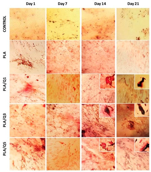 The presence of mineralized nodules on the surface of PLA and composites was evaluated qualitatively by staining the cells with an Alizarin red solution; the results are shown in Figure 8. The behavior that is observed for each material follows the same trend perceived in the other assays shown in Figure 6 and Figure 7. The PLA showed minimal mineralization at all evaluated test times. The PLA/chitosan composites showed a greater amount of mineral deposition, and presented an intense red staining, with nodules significantly bigger than those of PLA. This effect increases with time, starting on day 14, and is maintained until day 21. The chitosan addition to the composites significantly increases the mineralization. On day 14, there are many more mineralization nodules on the composite surfaces compared to PLA. The chitosan enhances the osteoblast mineralization due to its bioactive properties. The cells differentiate on the anionic matrix, absorbing calcium and phosphate ions, and then the calcification occurs by a nucleation and growth process [44,45].