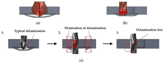 Representation of (a) traditional drilling; (b) orbital drilling [20] and (c) drill-milling processes. The red arrows indicate the load.