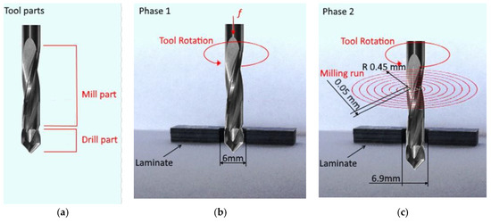 To fully eliminate the drilling-induced delamination, a different original technique for CFRP hole making is proposed in this work, where the hole is realised by means of a combination of drilling and peripheral milling processes. In Figure 1c, the two phases of the process are illustrated, namely: in the first phase traditional drilling is employed to produce a hole with a smaller diameter than the final hole, and then, in the second phase, the material around the first hole is removed by peripheral milling until the final diameter is achieved. These two phases are sequentially combined in a single process carried out using the same cutting tool.