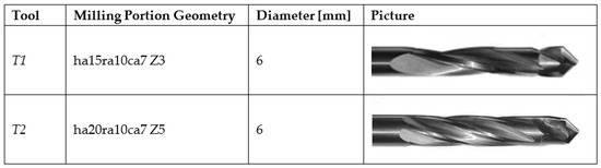 Two drill-milling tools characterised by different geometries were developed and employed for the experimental tests, to compare their performance. The characteristics and geometry of the two tools are shown in Figure 4. The first tool, T1, is made of tungsten carbide (WC) and has a 6 mm diameter and 100 mm length; the drilling portion is 8 mm long, with two cutting-edges, a 120° point angle, and a 20° helix angle; and the milling portion is 18 mm long, with three flutes, a 15° helix angle, a 10° rake angle, and a 7° clearance angle. The second tool, T2, is made of tungsten carbide (WC) and has a 6 mm diameter and 100 mm length; the drilling portion is 8 mm long, with two cutting-edges, a 120° point angle, and a 20° helix angle; and the milling portion is 18 mm long, with five flutes, a 20° helix angle, a 10° rake angle, and a 7° clearance angle.