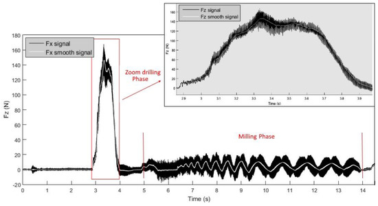 The values and trends of the Fx and Fz cutting force signals were studied to analyse the cutting forces that develop during the drill-milling process. It was observed that Fz is predominant in the first phase (drilling process), while Fx is predominant in the second phase, where it is possible to observe the characteristic sinusoidal pattern of the peripheral milling process. To perform signal smoothing, the moving average method (with a window length of 200 samples, corresponding to 0.02 s) was applied to the Fx and Fz signals, as reported in Figure 5 and Figure 6, respectively. The goal of smoothing is to facilitate the extraction of the maximum values of the force signals, without taking into consideration high-frequency oscillations.