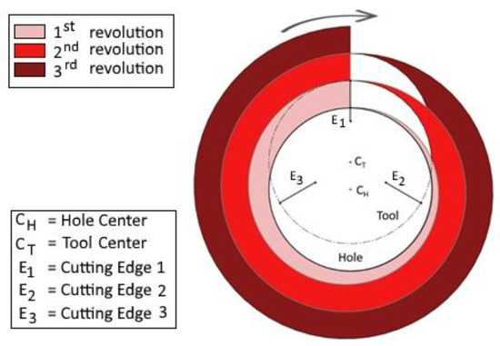 Scheme of the tool path during the drill-milling process. The removed material area increases at each revolution.