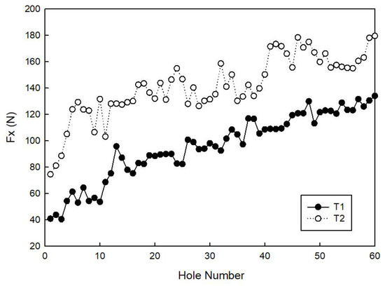 Figure 8 and Figure 9 show the maximum Fx and Fz cutting force values measured for all of the 60 holes made during the experimental testing campaign with tools T1 and T2. In all of the cases, an increase of both the Fx and Fz cutting forces with an increasing hole number, that is, with tool wear progression, is visible. Moreover, it can be observed that, during the tests with tool T2, the recorded forces in both the X and Z directions are higher than the ones recorded with tool T1. Using tool T1, the maximum thrust force, Fzmax, during the drilling phase is 201.27 N and the maximum radial force, Fxmax, during the milling phase is 134.05 N (hole number 60). Using tool T2, the maximum thrust force, Fzmax, during drilling is 188.41 N and the maximum radial force, Fxmax, during milling is 179.57 N (hole number 60). It was verified that the values of Fzmax are quite similar to those found in the literature [8,12] for a traditional drilling process.