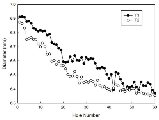 As shown in Figure 10, up until hole number 48, the tool T1 has a lower size reduction, whereas from hole number 48, both tools behave in a similar way.