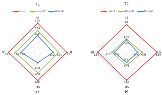 Hole diameter (mm) measured in four directions for holes number 1, number 30, and number 60, made by (a) tools T1 and (b) tool T2.