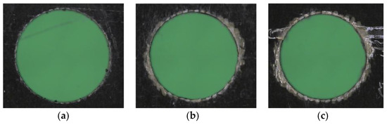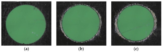 With regards to the roundness of the CFRP holes, Figure 11 shows that the holes made by tool T1 keep their roundness up to hole number 30, and lose their roundness in one direction at hole number 60, whereas the holes made by tool T2 do not display any loss of roundness. Figure 12 and Figure 13 show holes number 1, number 30, and number 60 realized with tools T1 and T2, respectively. No presence of uncut fibers was verified in the holes, even in the case of high tool wear, contrarily to what often happens for traditional drilling [14,25]. This was true for both the T1 and T2 tools, as it can be observed in Figure 12c and Figure 13c.