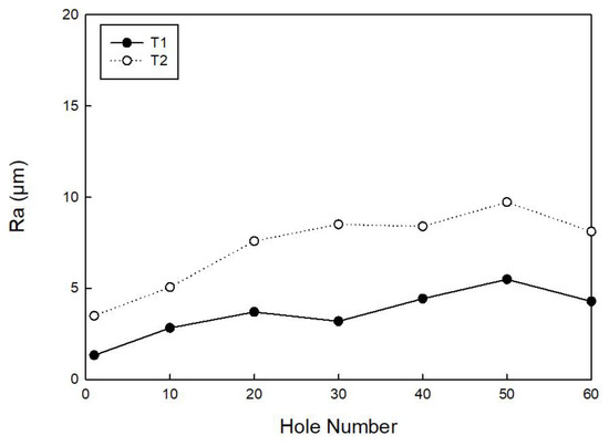 Figure 14 reports the Ra values for tools T1 and T2, showing in both cases an increase with the increasing hole number. The holes made with tool T2 have internal surface Ra values greater than those made with tool T1. For the holes made with tool T1, the difference of Ra values between hole number 60 and number 1 is 2.96 µm, whereas for the holes made with tool T2, the difference of Ra values between hole number 60 and number 1 is 4.62 µm. As identical cutting conditions were employed with both tools, the Ra difference can be related to the different wear level of the tool cutting-edge [28,29].