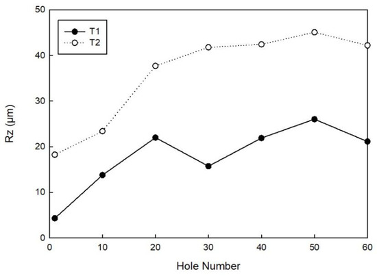 Rz measured for every ten holes made by tool T1 and tool T2.