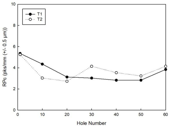 RPc measured for every ten holes made by tool T1 and tool T2.