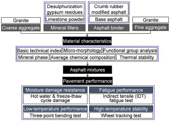 Based on the above, in order to fully use the low-quality aggregate, the feasibility of preparing asphalt mixture with granite acidic aggregate, DGR and RMA were fully investigated in this research. Three studies have been conducted: (1) The basic technical indexes and main material characteristics of raw materials including micro-morphology, functional group, mineral phase, chemical composition and thermal stability were detected and compared in order to fully recognize them. (2) Designing four asphalt mixtures (two asphalt binder and two fillers) by means of the standard Superpave procedure. (3) Determining the feasibility of preparing asphalt mixture with granite aggregate, DGR and RMA by comprehensive pavement performance evaluation, including moisture damage resistance, low-temperature crack resistance, high-temperature stability and fatigue performance. The research flow chart is shown in Figure 1.