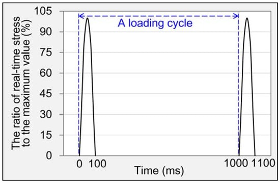 The fatigue crack resistance of asphalt mixture was evaluated by means of indirect tensile (IDT) fatigue test according to AASHTO-TP31 standard [31]. The samples were the same as those used in hot water damage test. IDT fatigue test was also conducted by UTM. The test temperature was 15 °C, and samples were moved to a temperature control chamber of UTM to keep the surface and internal parts at the same test temperature. Stress-controlled mode with three stress levels of 400, 500 and 600 kPa was adopted, and loading signal was haversine waveform as shown in Figure 4. Three replicates for every asphalt mixture at each stress level were considered. The loading number, at which the main radial crack propagated completely through the specimen, was defined as fatigue life (Nf).