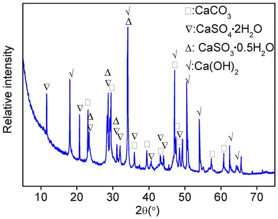 It is well known that the main phase of LP is calcium carbonate (CaCO3). The mineral phases of DGR are analyzed in this section. Figure 8 suggested that calcium carbonate, dihydrate gypsum (CaSO4·2H2O) and calcium hydroxide (Ca(OH)2) were the main phases of DGR. The phase types were directly related to the generation process of DGR. The absorbent for SO2 was a slurry of CaCO3/CaO, and CaO transformed into Ca(OH)2 under wet condition, which was the active ingredient for SO2 absorption. Ca(OH)2 turned into CaSO3·0.5H2O by absorbing SO2 in wet condition, which can be further oxidized into CaSO4·2H2O. It was the source of CaSO4·2H2O. This process was accompanied by the decomposition of CaCO3, which can provide sufficient CaO. It can be seen from Figure 8 that almost all strong diffraction peaks were possessed by Ca(OH)2. It meant that the dosage of CaCO3/CaO was excessive. A great amount of the remaining Ca(OH)2 gave DGR with high alkalinity, which was good for the bonding behavior of the asphalt mixture system.