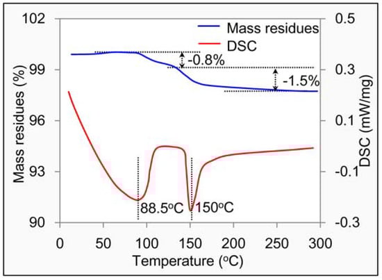Asphalt mixture was prepared at a high temperature of 165 °C for base asphalt and 185 °C for modified asphalt. Therefore, evaluating the thermal stability of DGR as a type of new filler was very important. Figure 10 shows the thermal analysis result of DGR. It shows that there are two stages. In the first stage, a strong endothermic peak appeared at 88.5 °C due to the volatilization of free water contained in DGR. It accordingly resulted in 0.8% of mass loss in this stage. In the second stage, another endothermic peak appeared at 150 °C; it belonged to the crystal water release of CaSO4·2H2O, and dihydrate gypsum transformed into half-water gypsum during this stage. About 1.5% of mass loss was seen. The total mass reduction was quite small, hence, the thermal stability of DGR was good in terms of mass change, while the phase types changed at the mixing temperature of asphalt mixture.
