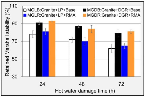 The original Marshall stabilities of MGLB, MGDB, MGLR and MGDR were 8.4, 8.9, 11.5 and 10.9 kN, respectively. This suggested that the contribution of RMA on increasing Marshall stability was big, and the increments for LP and DGR asphalt mixtures were 3.1 and 2.0 kN, respectively, while the effect of DGR on Marshall stability was weak and inconsistent for asphalt mixtures with different asphalt. The RMS values for each mixture after suffering different times of hot water damage are listed in Figure 13. The downward trend for all asphalt mixtures is displayed with the rise of damage time. Hence, the damage caused by hot water was serious. DGR showed a very positive role in maintaining the stability of asphalt mixture according to the results. For base asphalt, the RMS of asphalt mixture prepared with DGR was still up to 79% even after hot water damage for 72 h, and the value for LP asphalt mixture was only 62% under the same condition. For RMA, RMS of DGR asphalt mixture was as high as 81% after damage for 72 h, which was 16% numerically larger than that of LP asphalt mixture. Figure 13 also revealed that the type of asphalt weakly effected hot-water stability. The RMS of asphalt mixture containing LP and DGR simultaneously was largest among these four asphalt mixtures after a longtime hot water damage. Hence, it is preferable to prepare asphalt mixture with LP and DGR considering the hot water damage resistance.