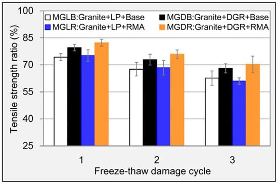 The original splitting strengths of MGLB, MGDB, MGLR and MGDR were 0.94, 0.97, 1.05 and 1.10 MPa, respectively. Hence, DGR and RMA both can enhance the strength of asphalt mixture. Compared to LP, DGR improved the strength of base asphalt mixture and RMA mixture by 3.2% and 4.8%, respectively. For RMA, the improved percentages were 11.7% and 13.4% for LP asphalt mixture and DGR asphalt mixture, respectively, compared to base asphalt. So the contribution made by RMA was much more obvious. Similar to the change rule of RMS, TSR for each mixture decreased gradually with the rise of freeze-thaw damage cycles (see Figure 14). DGR also performed better than RMA in maintaining the strength of asphalt mixture. Furthermore, compared to LP, DGR raised TSR value of base asphalt mixture and RMA mixture by 5.4% and 9.3%, respectively, even after three cycle’s freeze-thaw damage. For RMA, the situation was a little complex. RMA did better than base asphalt in maintain the strength of LP asphalt mixture at early stage of freeze-thaw damage. The rule gradually turned to the opposite with the strengthening of the damage degree. It meant that the durability of bonding feature between aggregate and RMA was insufficient. The strength loss of asphalt mixture containing RMA and DGR was smallest among these asphalt mixtures even serious freeze-thaw damage for three cycles was applied. It meant that the combination of RMA and DGR was also a good method to improve the freeze-thaw damage resistance ability.