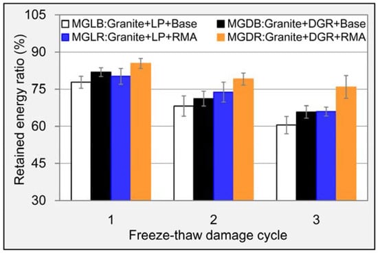 Figure 15 gave the computed results of RER. It can be seen that the change rule of RER was a little different from that of TSR. RMA also displayed an obvious effect on RER. Compared to base asphalt, the increment of RER caused by RMA were 5.5% and 10.1% for LP asphalt mixture and DGR asphalt mixture, respectively, even after three cycle’s freeze-thaw damage. For DGR, its contribution were 5.3% and 9.9% for base asphalt mixture and RMA mixture, respectively. And the RER of asphalt mixture containing DGR and RMA was still up to 75.9% after serious freeze-thaw damage. The loss ratio of RER was less than that of spitting strength; this was because of the crumb rubber contained in RMA which enhanced the flexibility and the ability of bearing big deformation. Large deformation will result in big fracture energy according to Equation (3). Concluding this section, the combined use of DGR and RMA played a much more positive role in improving the water damage resistance of asphalt mixture than when they were used alone.
