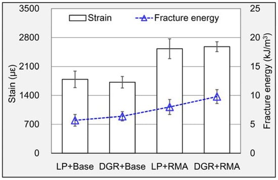 The computed strain and fracture energy of these four asphalt mixtures are shown in Figure 16. In terms of strain, LP and DGR almost performed the same either in base asphalt mixture or RMA mixture. While the effect of RMA on the low-temperature strain was significant. Compared to base asphalt, RMA increased the strain of LP asphalt mixture and RMA mixture by 41.3% and 50.0%, respectively. It indicated that the introduction of crumb rubber enhanced the deformability of asphalt mixture at low temperature. In terms of fracture energy, the energy values were gradually rising by changing filler types and asphalt types in turn. It suggested that the DGR and RMA both can improve the fracture energy of asphalt mixture. Asphalt mixture prepared with DGR and RMA possessed the largest fracture energy, about 10 kJ/m3. Therefore, similar to moisture stability, the combination of DGR and RMA did better in improving the low-temperature performance of asphalt mixture.