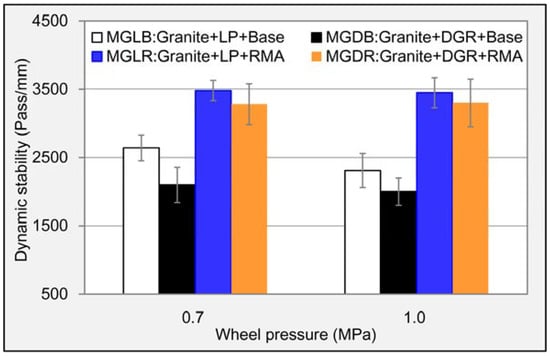 The high-temperature stability is very important to the durability of asphalt pavement especially at some regions of higher temperature. The computed dynamic stabilities of the four asphalt mixtures are displayed in Figure 17. It clearly shows that the DGR worsened the high-temperature deformation resistance of asphalt mixture. Specifically, at wheel pressure of 0.7 MPa, the reduction percent of dynamic stabilities for base asphalt mixture and RMA mixture caused by DGR were 20.5% and 5.7%, respectively, and which were 13.4% and 4.3% at wheel pressure of 1.0 MPa. This may be due to the sleek and ellipsoid appearance of DGR particles, which made asphalt mastic easy to flow. The improvement made by the rubber was compelling. At wheel pressure of 0.7 MPa, 31.8% and 56.2% higher dynamic stability were shown for LP asphalt mixture and DGR asphalt mixture, respectively, compared to base asphalt. The values were 49.4% and 65.0%, respectively, at wheel pressure of 1.0 MPa. This was mainly due to the contribution of rubber’s excellent elasticity. The results suggested that RMA obviously made up the weakness of DGR in terms of high-temperature performance of asphalt mixture. Figure 17 also indicated that the change of dynamic stability for RMA mixture was quite small when applied wheel pressure increasing from 0.7 MPa to 1.0 MPa. Hence, the RMA was suitable for the road located in the high-temperature region.