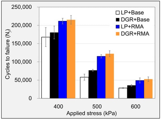 Figure 18 gave the fatigue life results of every asphalt mixture at each stress level. It displayed that the fatigue lives of all asphalt mixtures rapidly decreased with the rising of stress levels. A more significant fluctuation can be observed at the low stress level. DGR and RMA both showed good potential to raise fatigue life of asphalt mixture. Furthermore, DGR raised the fatigue lives of base asphalt mixtures tested at 400, 500 and 600 kPa by 7.6%, 32.4% and 25.0%, respectively. The values were 1.7%, 6.0% and 7.1% for RMA mixture. In terms of RMA, it increased the fatigue lives of LP asphalt mixtures tested at 400, 500 and 600 kPa by 26.1%, 98.6% and 73.5%, respectively, and the percentage increases in fatigue lives were 19.2%, 58.9%, and 48.6%, respectively, for DGR asphalt mixtures. It indicated that the improvement of fatigue life made by RMA was much more obvious. Figure 18 also showed that asphalt mixture containing DGR and RMA simultaneously always possessed the highest fatigue lives among the four asphalt mixtures at all stress levels. So the combination of DGR and RMA also did better in improving fatigue life of asphalt mixture than when they were used alone.