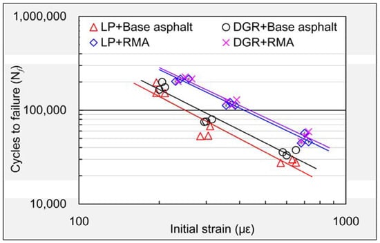 The relationship between fatigue life and initial strain caused by applied stress was displayed in a double logarithmic coordinate system as shown in Figure 19. The fatigue life and initial strain should meet linear relationship at double logarithmic coordinate system according to Equation (7). The parameter n in Equation (7) corresponded to the slope of the fitting line shown in Figure 19. So the absolute value of parameter n can reflect the falling speed of fatigue life for certain asphalt mixture with the increase of stress level. It can be seen from the figure that the absolute values of parameter n for MGLB, MGDB, MGLR and MGDR were gradually reduced. It meant that the fatigue durability of asphalt mixture prepared with DGR and RMA was the best among these asphalt mixtures, and the fatigue equations determined by regression analysis (see Table 7) also supported this conclusion, although the absolute value of parameter n (1.34) was just a little smaller than that of asphalt mixture containing LP and RMA (1.36).