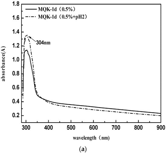 Since the emulsified asphalt in this research is cationic emulsified asphalt, blue or red shifts of the peaks of the emulsifier may occur in the ultraviolet spectrum under the environment of pH = 2. Thus, the comparison data MQK-1D (0.5% + pH2) were added. Test results suggest that the pH value has no significant effect on the position of the emulsifier peak, and thus it can be considered λmax = 304 nm.