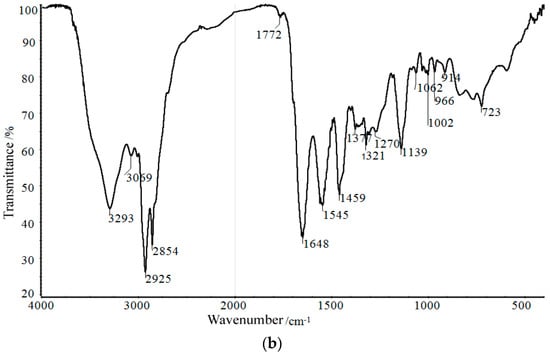 In this paper, the KunLun AH-70 asphalt was chosen as the matrix asphalt, and the corresponding cationic emulsified asphalt was used [20]. A slow-cracking and fast-setting type emulsifier named MQK-1D from MeadWestvaco Corporation in the United States was selected. It mainly consists of amino amide compounds generated from fatty acid and polyamine condensation [21] (under the ultraviolet spectrum, the absorption peak position is λmax = 304 nm). Emulsified asphalt properties are presented in in Table 1. MQK-1D Infrared Spectrogram and UV spectrum are shown in Figure 1.