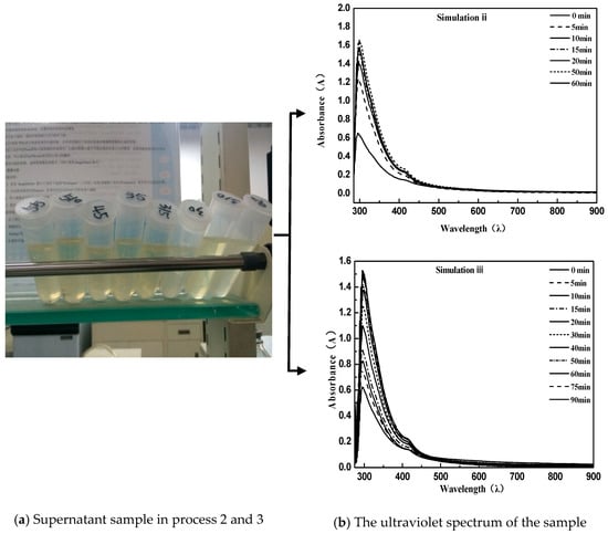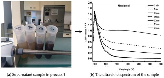 As can be seen from the above Figure 2 and Figure 3, the directly sampled supernatant was turbid, and the solution contained a large amount of suspended asphalt particles. This phenomenon had a great deviation from the experimental results. Simultaneously, it led to the disruption of the UV spectrum measurement and the inability to characterize the emulsion demulsification process. Instead, the treated supernatant contained very few suspended asphalt particles with a clear and transparent solution; meanwhile, the obtained UV spectrum data were consistent with the emulsified asphalt emulsion breaking rules.