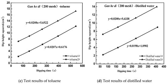 Based on the above test results, a relationship diagram was established between y and x, where the square of the slope is the polar force component of the measured interface, and the square of the intercept is the dispersion force component of the measured interface. The dispersion force component of Gan he di (200 mesh) is calculated to be 19.85 mJ·m−2, the polar force component is 24.13 mJ·m−2, and the final surface energy is 43.98 mJ·m−2.