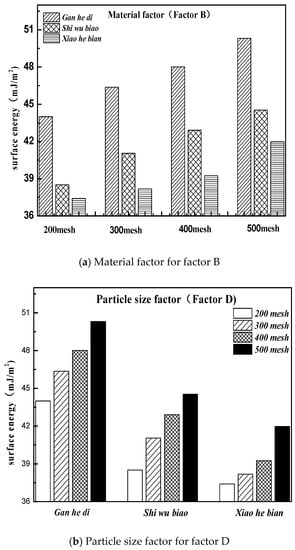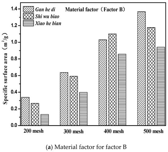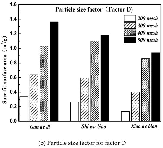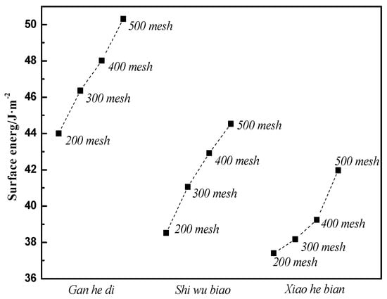 It can be seen from Figure 14 that the specific surface area parameters of aggregates decreased with the increase of particle size, and the specific surface area parameters of different aggregates were not the same. The specific situation was 500 mesh > 400 mesh > 300 mesh > 200 mesh; Gan he di > Shi wu biao > Xiao he bian. The surface energy parameter of Shi wu biao, with a particle size of 400 mesh, was slightly larger than that of Gan he di, which may have been due to the random error generated by the experiment). In order to study the relationship between the specific surface area parameters of aggregates and the emulsion breaking speed of emulsified asphalt, the grey correlation was used for analysis. The results are shown in Table 7.