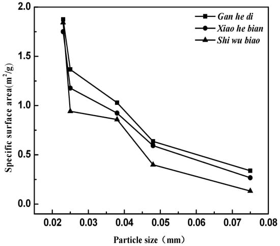 The relationship between the specific surface area of the limestone aggregates and the particle size is established, as shown in Figure 11.