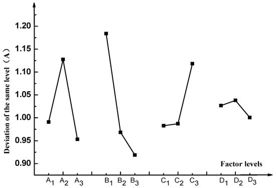 (2) From the Figure 12, the deviation of the factor D (particle size) was the smallest, which indicates that the particle size factor had a lower impact on the breaking speed of the emulsified asphalt. The reason for the analysis may be due to the small difference in the particle size of the aggregates selected in this experiment.