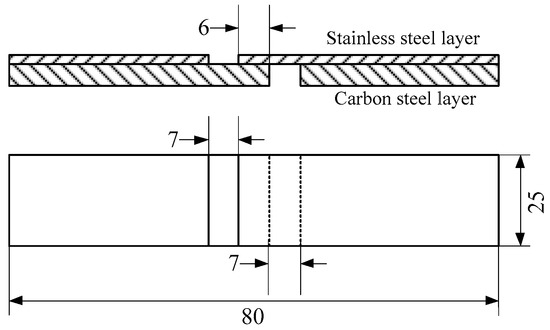 For clad plates, the bond strength of the composite interface is the most important performance, and the shear strength of the interface bond strength will determine the main properties of the clad plates. In this paper, the bonding strength of the interface of stainless steel clad plate was tested by shear testing. According to the standard of GB/T 6396-2008 [14], the clad plates after hot rolling was cut into standard shear samples by wire cutting, and the dimensions are shown in Figure 2. The test was carried out on an electronic universal testing machine.