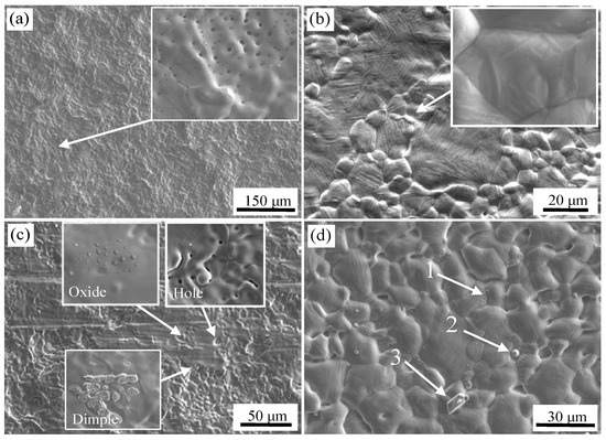 The SEM images of the surface of 304 stainless steel and carbon steel after high-temperature oxidation experiments for the two kinds of surface treatment are shown in Figure 4. It can be seen that the irregular lamellar shape of the stainless steel surface after brush grinding was basically eliminated in Figure 4a, but the surface was still not flat and initial joining did not appear on the composite surface. The stainless steel substrate was austenite after cooling. With the growth of grains, the surface of the stainless steel exhibited some ups and downs, but not obviously. Moreover, the physicochemical properties of the two metals were quite different, and they required more pressure to generate bonding. The clamping force was insufficient to form the initial bonding. The inclusions were not detected in the flat area of stainless steel in the enlarged area by WDS analysis. A number of circular inclusions of different sizes were formed in depressions [18]. The main constituents were O: 48.0 at %, Al: 5.2 at %, Si: 10.0 at %, Mn: 4.3 at %, Cr: 4.2 at %, Ni: 0.9 at %, and the balance was Fe.