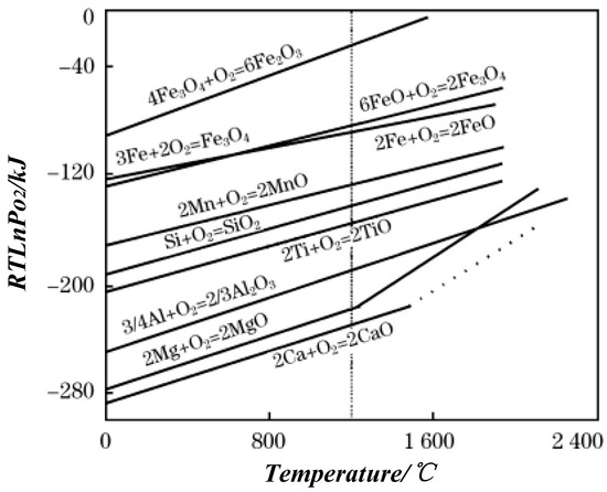 When the metal is oxidized, the free energy (ΔG0) depending on metal oxide is formed, which indicates the affinity between the metal and oxygen. The lower the value, the higher the stability of oxide and easier the metal is oxidized under lower free energy [19]. Figure 5 shows the ΔG0–T diagram of the metal oxidation reaction [20], which is used to determine the possibility of an oxidation reaction. When the temperature is 1200 °C, 304 stainless steel and Q345 carbon steel are expected to form complex oxidation. The ΔG0 of Al, Si, Mn, Cr, and Fe oxides are different, and the increasing sequence is ΔGAl2O3 < ΔGSiO2 < ΔGMnO < ΔGCr2O3 < ΔGFeO < ΔGFe3O4 < ΔGFe2O3, that is, the affinities of Al, Si, Mn, Cr, Fe, with O decrease. Thus, Al was preferentially oxidized to Al2O3. Meanwhile, Al diffused to the surface due to concentration difference. The content of oxygen in the valley or depressed surface region is high, and Al below the surface did not diffuse to the interface to react. While Al on the surface was consumed, the oxygen continued to react with Si and Mn. However, the oxygen content was limited, which resulted in the formation of composite inclusions dominated by Al2O3 and Si-Mn oxides.