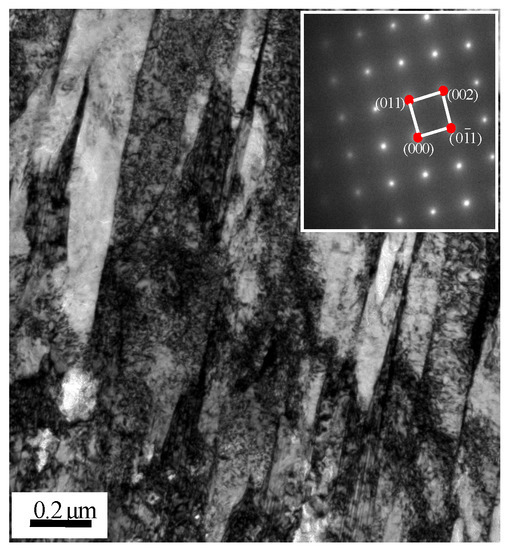 In order to further verify the presence of martensite, TEM specimens were prepared by an ion thinning method. The microstructure of the composite region was clearly observed. A large number of lath martensite structures and diffraction spots of bcc martensite were observed in Figure 6, which confirmed the existence of martensite. The chemical composition of carbon steel surface inclusions was studied by WDS and was O: 20.5 at %, Al: 10.3 at %, Si: 0.6 at %, Mn: 2.2 at %, Cr: 7.1 at %, Ni: 0.7 at %, and the balance was Fe, and Al2O3 and Si-Mn oxides were formed according to selective oxidation.
