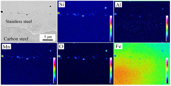 The microstructure of the interface after brush grinding is presented in Figure 8a,b. There were two kinds of inclusions with different morphologies at the composite interface. That is, the sporadic distribution of particles and the short rod-like segregation into the interfacial distribution along the band. Nomura et al. [24] found that Si-Mn oxides were easily formed on the surface of steel containing Si and Mn, which are considered to be sensitive to oxidation. The machined carbon steel and stainless steel surface adsorbed O on the surface. These O atoms at the interface reacted preferentially with the easily oxidized elements, which were Si and Mn on both sides of the interface during prolonged heating and formed a thin layer of Si-Mn oxides. The oxidation layer was dispersed at the composite interface after rolling. The EPMA analysis of the composite interface is shown in Figure 9. Elements Al, Si, Mn, and O were segregated near the interface. The segregation of Al element is less, and Al2O3 inclusions were preferentially generated based on the principle of selective oxidation. However, Si and Mn had a higher amount of segregation and reacted with the remaining O; Si-Mn oxides were finally formed.