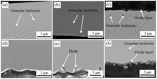Micrographs of carbon steel and stainless steel corresponding to the vacuum of 10−2 Pa are shown in Figure 12a,d. The surface inclusions of carbon steel were mainly TiN, MnS and Al2O3 after pickling in the high-temperature oxidation experiments. A small amount of Ca-Mg-Al-Si composite oxides were formed on the surface of stainless steel according to high temperature oxidation experiments. The forming mechanism of surface inclusions has been discussed in Section 3.1.