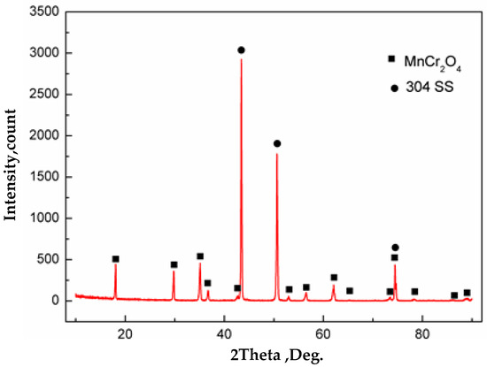 Morphologies of samples with the vacuum of 105 Pa are shown in Figure 12c,f. It can be seen that the surface of carbon steel and stainless steel were completely covered with oxides. The chemical composition of carbon steel surface was detected by WDS, which were O: 37.3 at %, Si: 0.8 at %, and the balance was Fe. Thus, oxides were formed on the surface of carbon steel. Severe oxidation of iron and oxygen occurred at 1200 °C. The chemical composition of stainless steel surface was O: 51.5 at %, Cr: 24.0 at %, Mn: 12.6 at % and the balance of Fe, as detected by WDS. Also, based on the XRD analysis of the surface of stainless steel as shown in Figure 13, almost all the inclusions on the surface of stainless steel were MnCr2O4. The composite interface was in contact with the outside atmosphere at vacuum of 105 Pa. During subsequent heating, the stainless steel was severely oxidized. Due to the high content of Cr in stainless steel, a layer of Cr2O3 protective film was first formed on the surface of stainless steel at high-temperature and high-oxygen conditions according to the selective oxidation mechanism. With the progression of the oxidation, Cr2O3 was continuously generated and covered the entire stainless steel surface, which isolated the stainless steel matrix from the atmosphere. If Cr continues to oxidize on the composite surface, alloying elements must diffuse through the Cr2O3 layer to the surface and react with oxygen. Meanwhile, the lattice diffusion coefficient of Mn ions in Cr2O3 was two orders of magnitude higher than that of Cr ions, and its diffusion rate was faster than Si, Fe and Ni in stainless steel [26]. Therefore, Mn in the stainless steel matrix is the first to diffuse to the surface of Cr2O3 and reacts with oxygen to form MnO. When Cr2O3 and MnO are present on the surface of stainless steel, MnCr2O4 spinel oxides are formed [27,28].