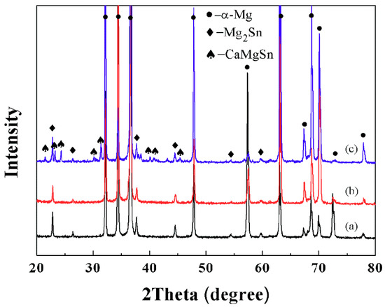 XRD patterns and analysis results of as-cast Mg-Sn alloys: (a) Mg-6Sn; (b) Mg-6Sn-2Zn; and (c) Mg-6Sn-2Zn-1Ca.