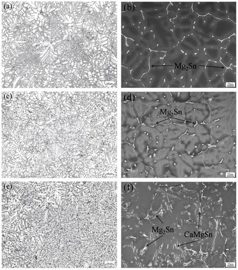 Optical microstructure and SEM images of as-cast samples: (a,b) Mg-6Sn; (c,d) Mg-6Sn-2Zn; and (e,f) Mg-6Sn-2Zn-1Ca.