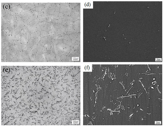 Figure 4 shows the optical microstructure and SEM images of as-homogenized Mg-6Sn, Mg-6Sn-2Zn, and Mg-6Sn-2Zn-1Ca alloys. After being homogenized at 480 °C for 12 h, α-Mg dendrites turned to be nearly equiaxed. The coarsening of α-Mg grains was also observed. The average grain size of as-cast Mg-6Sn, Mg-6Sn-2Zn, and Mg-6Sn-2Zn-1Ca alloys was increased to 203 ± 19 μm, 144 ± 23 μm, and 138 ± 26 μm, respectively. Most of Mg2Sn phase in Mg-6Sn and Mg-6Sn-2Zn alloys dissolved into α-Mg matrix, and only several small Mg2Sn particles were observed at grain boundaries (seen from Figure 4a–d). However, in the as-homogenized Mg-6Sn-2Zn-1Ca alloy, although eutectic and precipitated Mg2Sn phase almost dissolved into α-Mg matrix, CaMgSn phase remained, as seen in Figure 4e,f. The shape of the CaMgSn phase was almost the same as that in the as-cast state, which indicates that the thermal stability of the CaMgSn phase was better than the Mg2Sn phase.