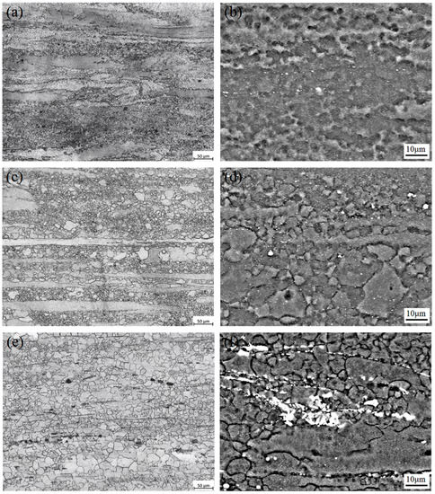 Figure 5 displays the optical microstructure and SEM images of as-extruded Mg-6Sn, Mg-6Sn-2Zn, and Mg-6Sn-2Zn-1Ca alloys (along the extrusion direction). As seen in Figure 5a,c,e, incomplete dynamic recrystallization (DRX) takes place in the as-extruded Mg-Sn alloys and the microstructure was obviously refined. The microstructure of the as-extruded Mg-Sn alloys mainly consisted of refined DRX grains and coarse elongated grains. As shown in Figure 5b,d,f, dense precipitates were observed in the α-Mg matrix in the as-extruded Mg-Sn alloys. According to Chang et al. [13], these fine precipitates were probably of the Mg2Sn phase, which form dynamically during hot extrusion. Furthermore, as seen in Figure 5f, the needle-like CaMgSn phase in the as-homogenized Mg-6Sn-2Zn-1Ca alloy was broken into particles and distributed along the extrusion direction.