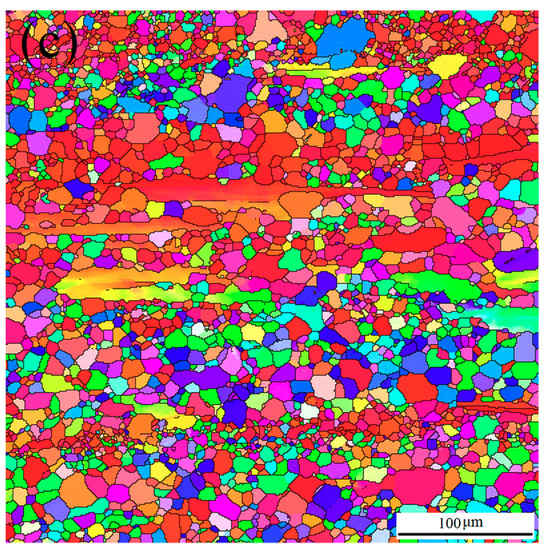Inverse pole figure maps of as-extruded Mg-Sn alloys obtained by electron backscattered diffraction (EBSD, along the extrusion direction): (a) Mg-6Sn; (b) Mg-6Sn-2Zn; and (c) Mg-6Sn-2Zn-1Ca.