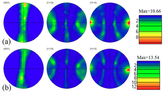 Figure 7 shows the corresponding pole figures of the as-extruded Mg-6Sn, Mg-6Sn-2Zn, and Mg-6Sn-2Zn-1Ca alloys obtained by EBSD (along the extrusion direction). As shown in Figure 7, the as-extruded Mg-Sn alloys exhibited typical fiber texture. The {0001} basal plane of Mg was aligned along the extrusion direction with its <10–10> direction parallel to the extrusion direction. This kind of texture is in accordance with the usual extruded structure in Mg alloys. As for the texture intensity, the addition of Zn element led to an increase from 10.66 of the as-extruded Mg-6Sn alloy to 13.54 of the as-extruded Mg-6Sn-2Zn alloy. However, the further addition of Ca element led to a significant decrease from 13.54 of the as-extruded Mg-6Sn-2Zn alloy to 7.24 of the as-extruded Mg-6Sn-2Zn-1Ca alloy.